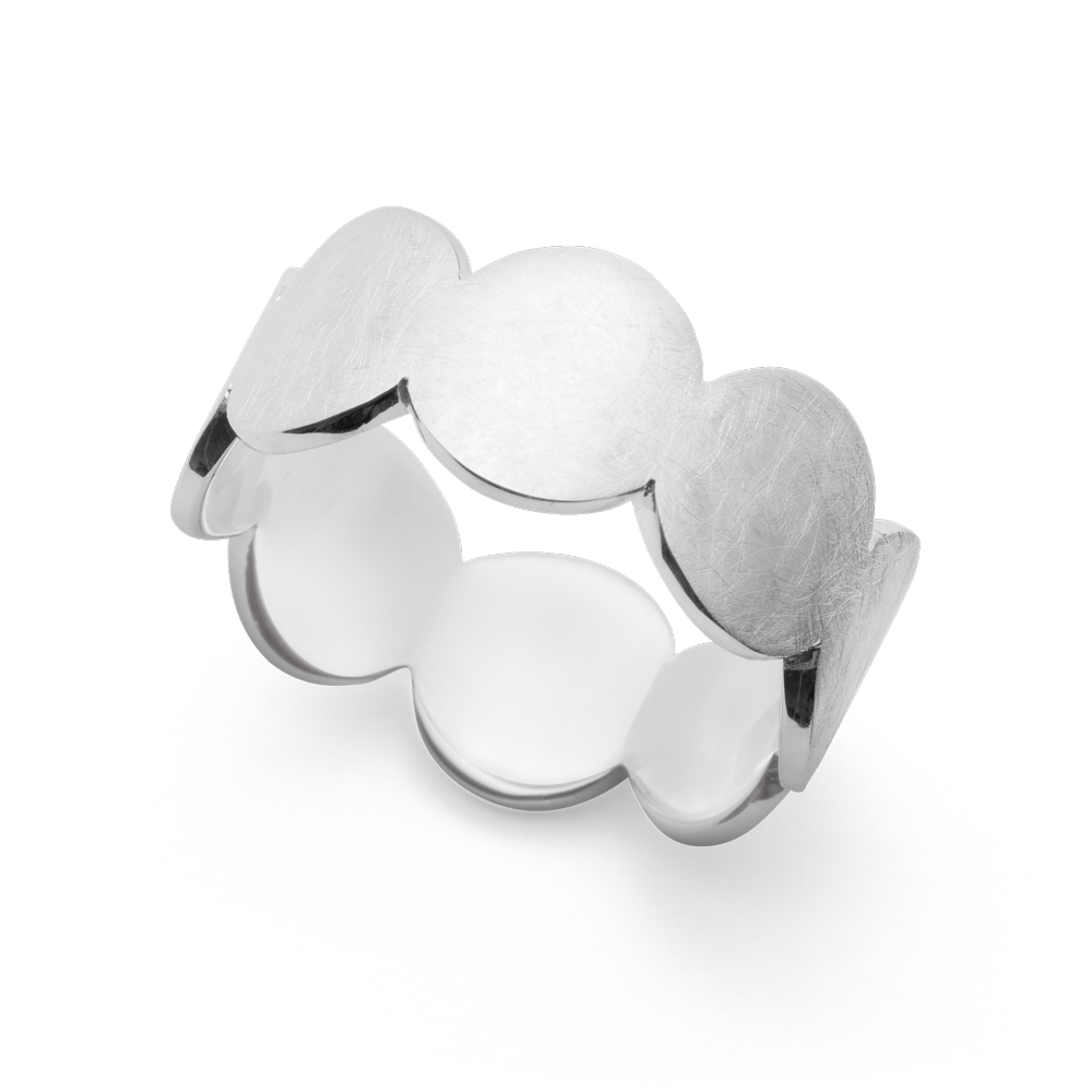 Runde smykkeelementer kombineret danner en karakterfuld designring lavet af ridsemattet 925/- sterling sølv. Dette smykke er skabt med stor sans for detaljer af designeren Nadine Resch. Et sandt smykkestatement til hverdagen eller en helt speciel lejlighed. Perfekt i kombination med det matchende vedhæng. En sensuel, buet form og en gennemgående karakteristisk designsignatur kendetegner freelancedesigneren Nadine Reschs smykkekreationer, der bor i Düsseldorf. Hendes mangefacetterede design giver altid frisk inspiration og gør oprør mod nutidens ensartethed. Alle bastian inverun smykker leveres inklusive matchende smykkeemballage. Dimensioner: Ringbåndets bredeste punkt: 0,8 cm Diameter på de runde elementer: 0,8 cm