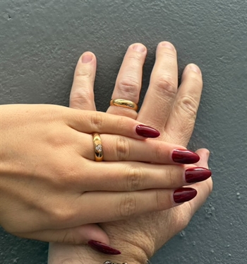 Ringene har et romantisk avrundet utseende, og i damens ring er det tre stykker 0,03 ct klimavennlige diamanter satt i en gripekontakt, som et elegant hjerte