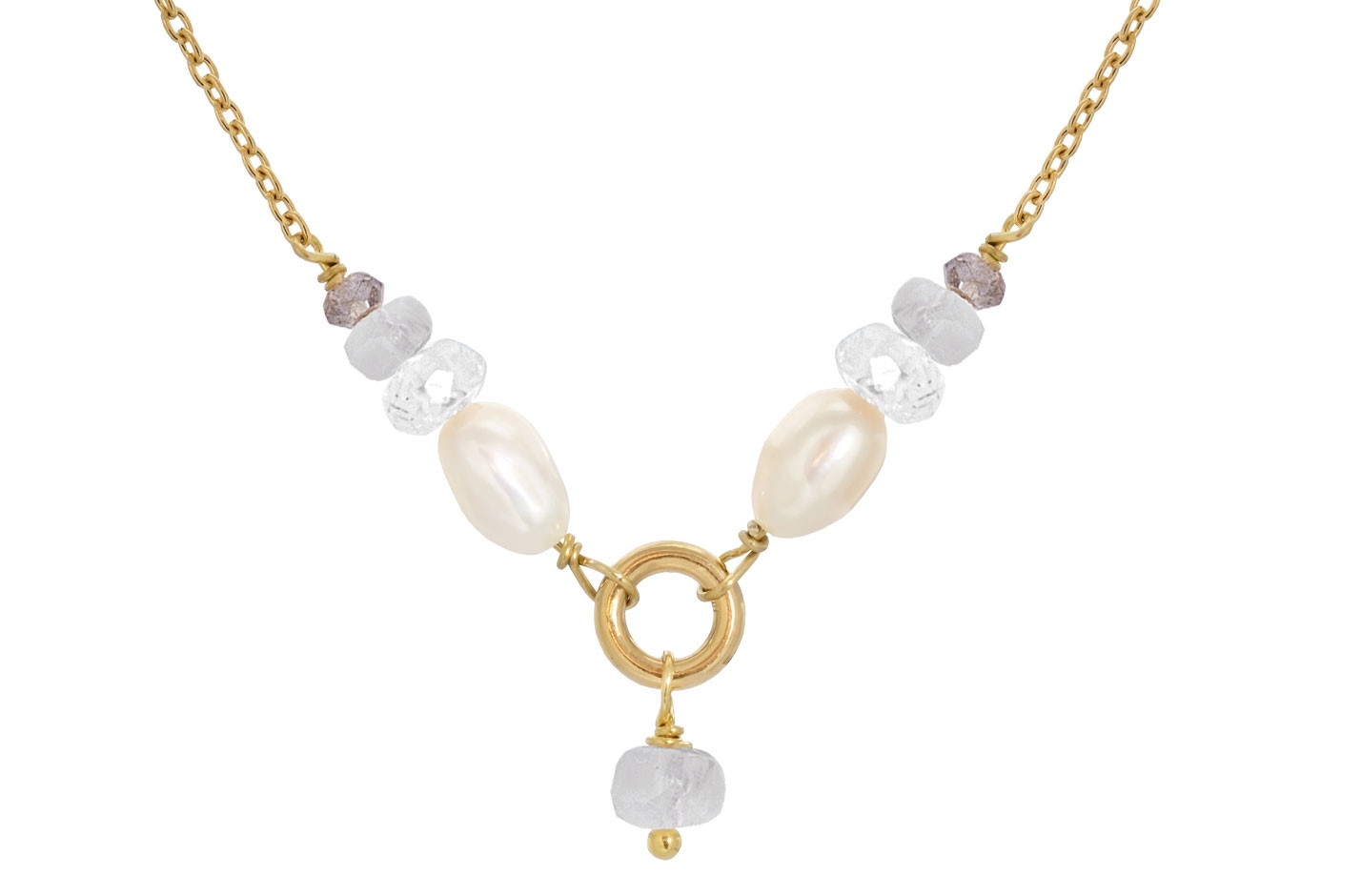 Hvide ferskvandsperler, bjergkrystal, rainbow månesten, labradorit