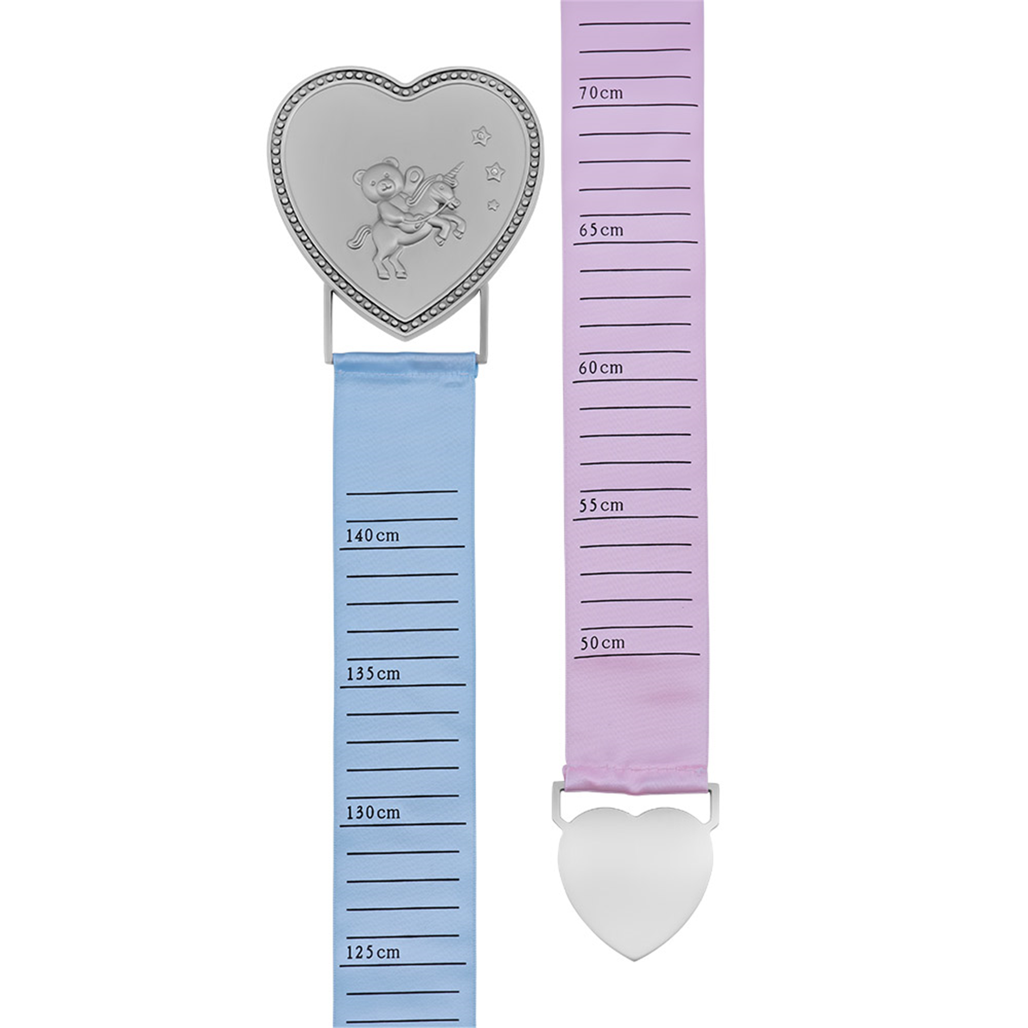 Et fint målebånd med fortinnede hjerter. Gaveboksen indeholder både et lyserødt og lyseblåt satinbånd. Målebåndets top er formet som et hjerte, med sødt motiv af en bamse, der kommer ridende på en enhjørning mellem stjernerne. I bunden