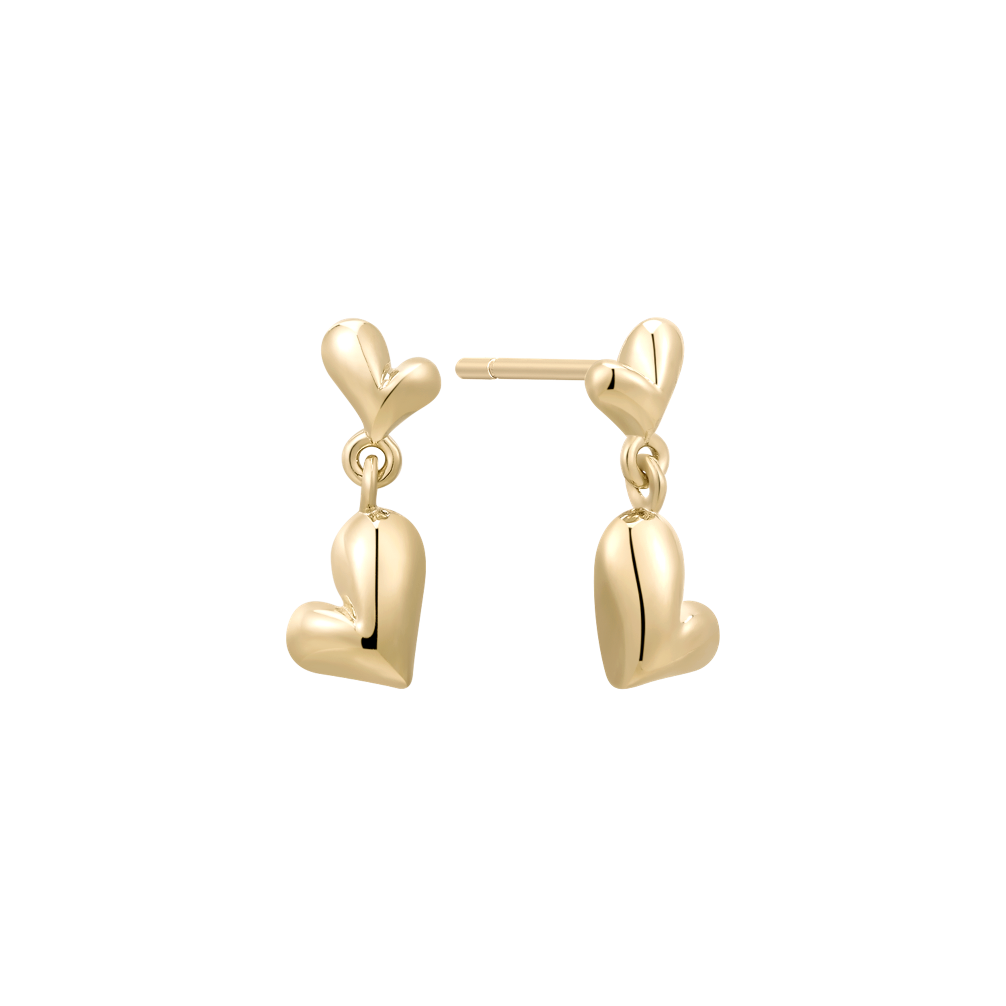 8 kt. guld ørehænger 2 skæv hjerter hvor den stor hjerte hænger.