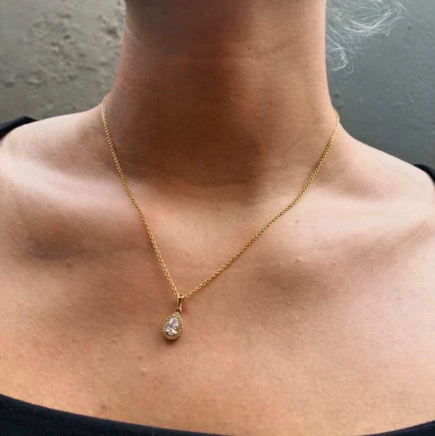 Vakkert og elegant drop -anheng i 8 karat gull. Anhenget er besatt med et stort zirkonia -sett 18 små. En 45 cm gullbelagt kjede følger med., 7 mm x 10 mm