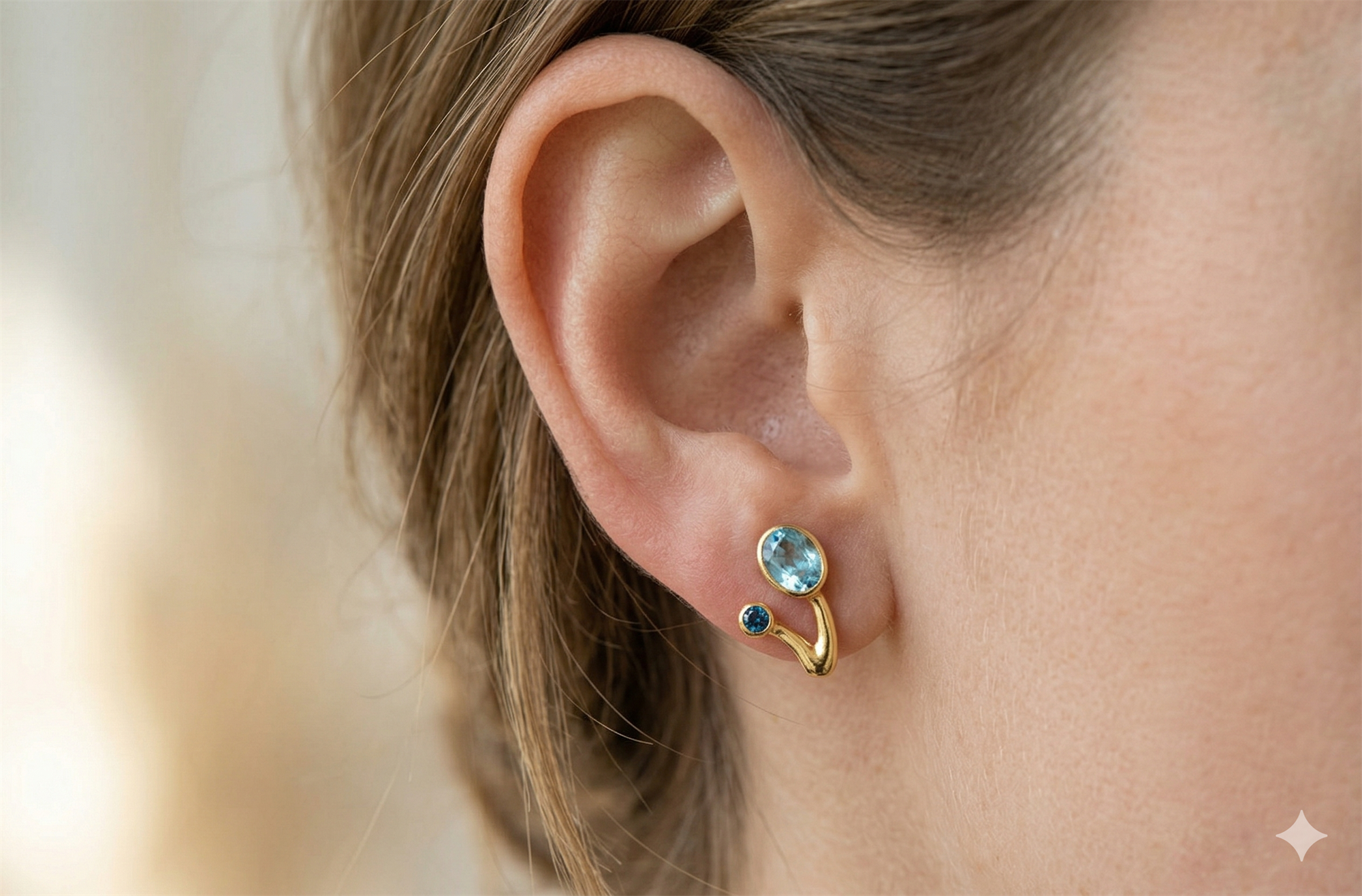 Øreringen er nøye laget i forgylt sterlingsølv, som gir en varm og innbydende glød. Smykket er prydet med en 5x4mm akvablå kvarts og en 2mm London blå topas, sammen skaper de en fengslende blanding av blåtoner som minner om havets dybder.