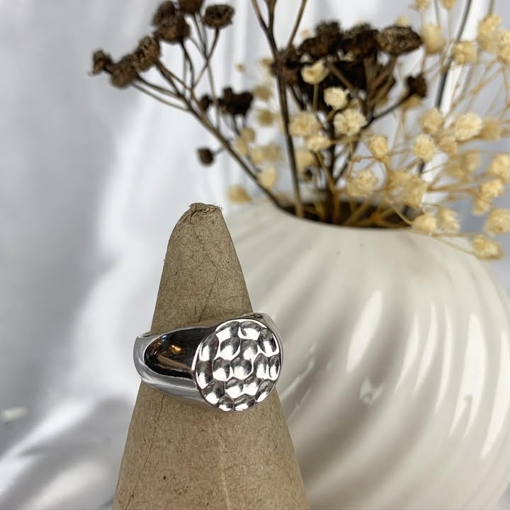 Signert fingerring i sølv med bølget overflate. Til ringen finner du passende øredobber., Ø 13 mm øverst