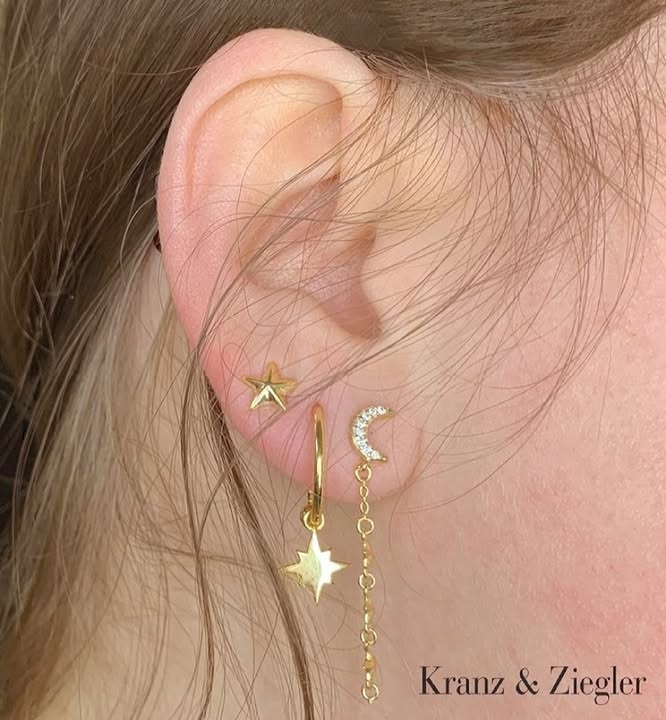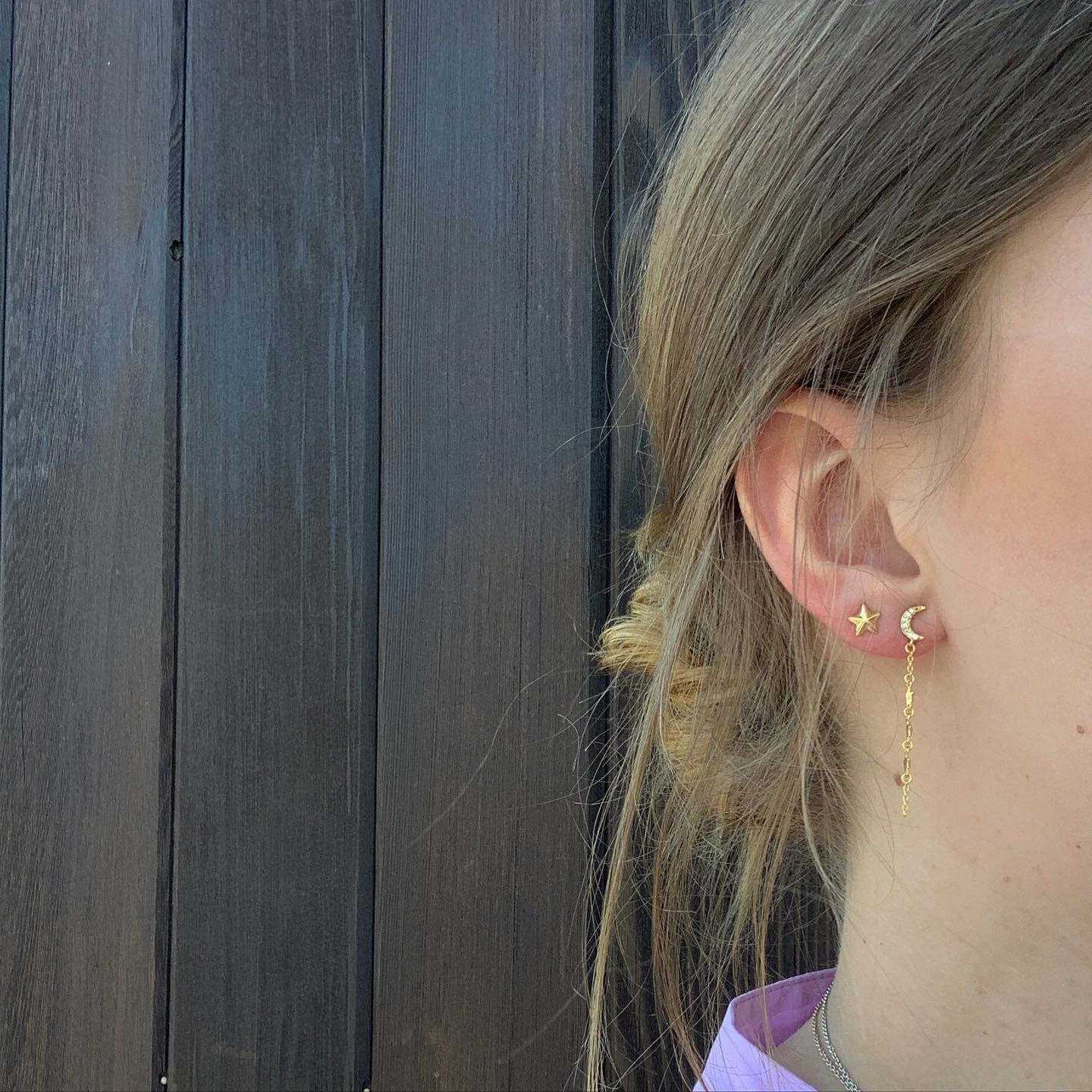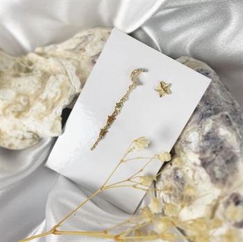Den ene øredobben er en stjerneformet ørering, mens den andre er en lang ørering med både måne, stjerner og hvit zirkonia på.