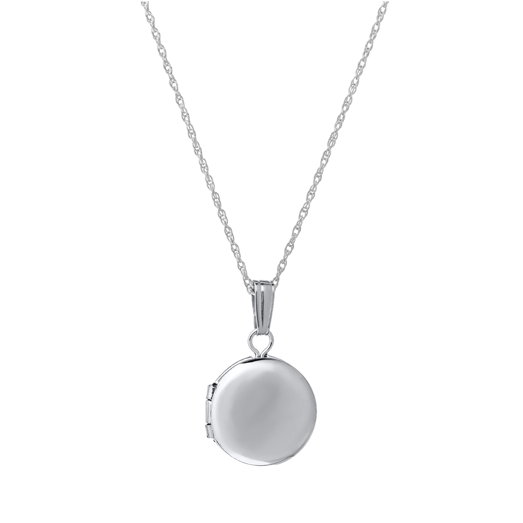 Sød og enkel rund medaljon i rhodineret sølv. Medaljonen er blank på både forsiden og bagsiden. Medaljonen er ikke ment til billeder, men der kan lægges noget ind i hulrummet. Vedhænget måler 10 mm i højden og 10 mm i bredden, og der medfølg