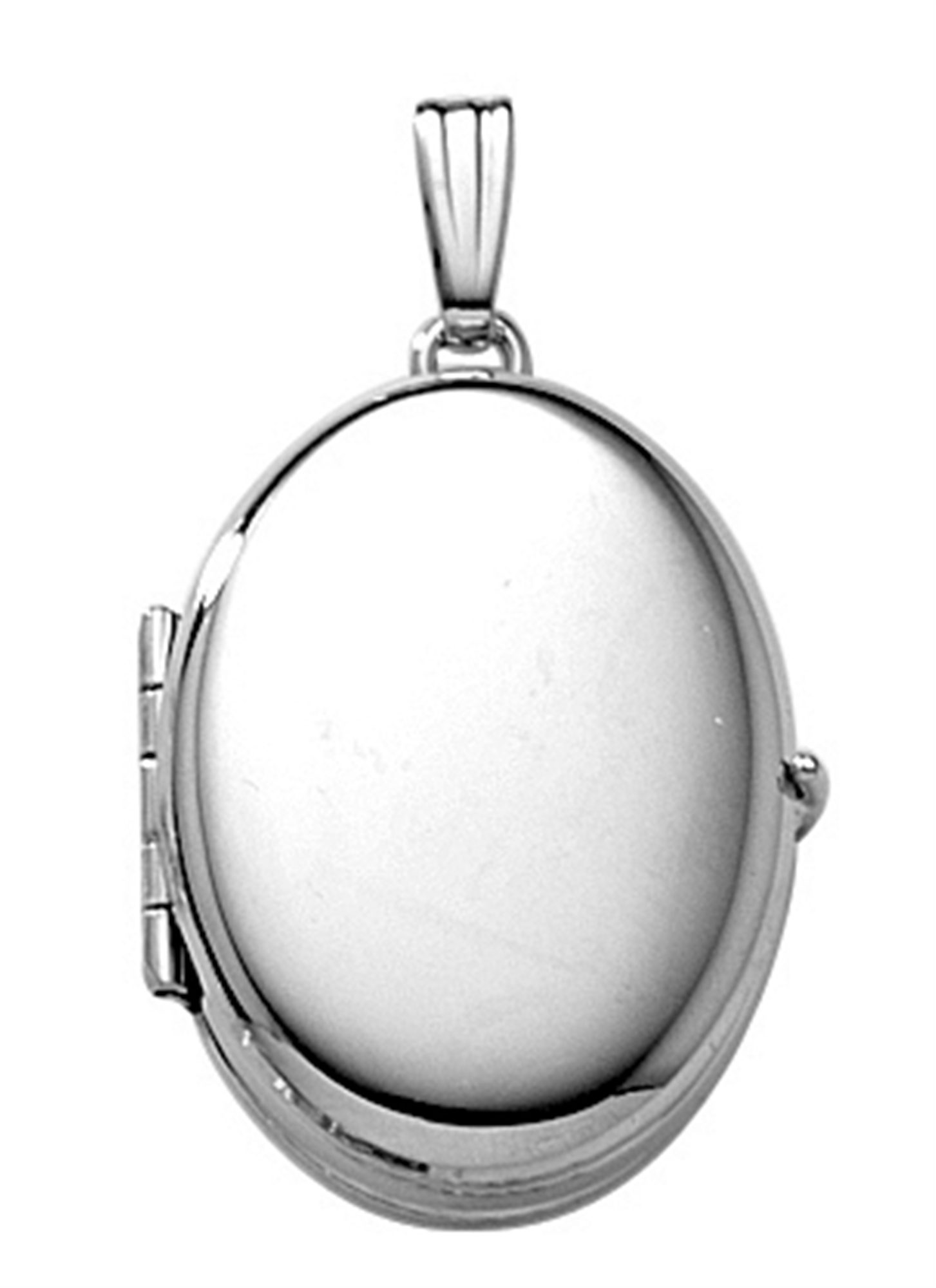 Enkel og klassisk oval medaljon i rhodineret sølv. Medaljonen er helt blankt på både forsiden og bagsiden. Der er plads til to billeder inden i. Der medfølger en 50 cm lang rhodineret sølvkæde. Gravering: Medaljone