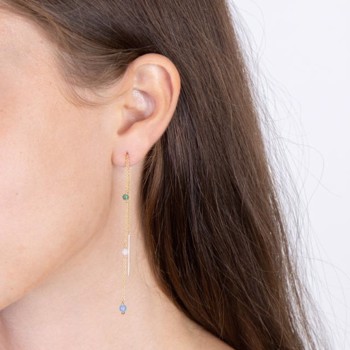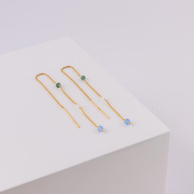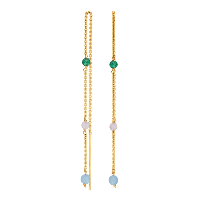 Øredobbene har et langt og feminint design, som er dekorert med natursteinene rosekvarts, aventurin og chalcedony.