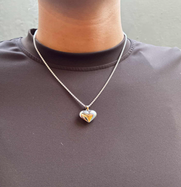 Håndlaget kjede i massivt sølv med fyldig hjertevedheng, 18 x 21 mm Et deilig håndlaget design av beste kvalitet fra Guldsmed og eier av Randers Sølv , Troels Tvenstrup. Halskjedet har et kjærlig lite hjerte -anheng fullt av sjarm.