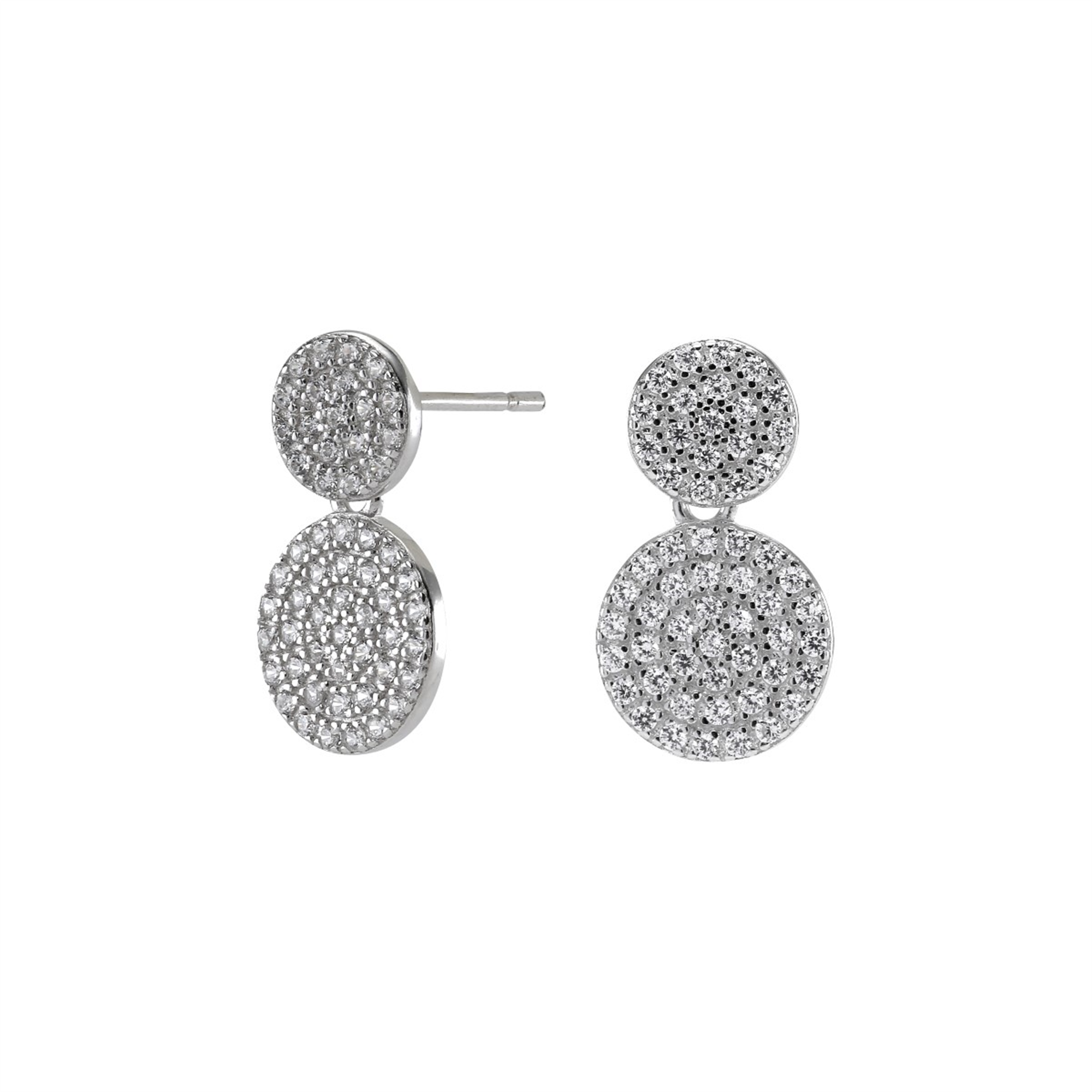 Spektakulære øreringe, som oser af elegance – perfekte til formelle begivenheder, hvor smykkerne gerne må være ekstraordinære. Vores Annie øreringe, i rhodineret sølv, er i sandhed en fryd for øjet. Øreringenes to runde flader er besat med funklende, h