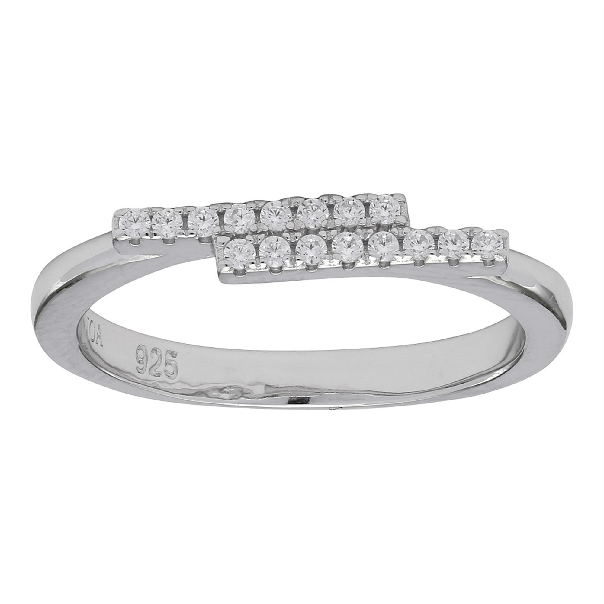 Vores Amira ring er perfekt for hende, der har en lidt vovet og edgy stil. Den rhodineret sølvring samles på midten af to forskudte, aflange stave - begge med påsatte zirkonia sten. Sammensæt ringen med andre sølvringe for et unikt look.