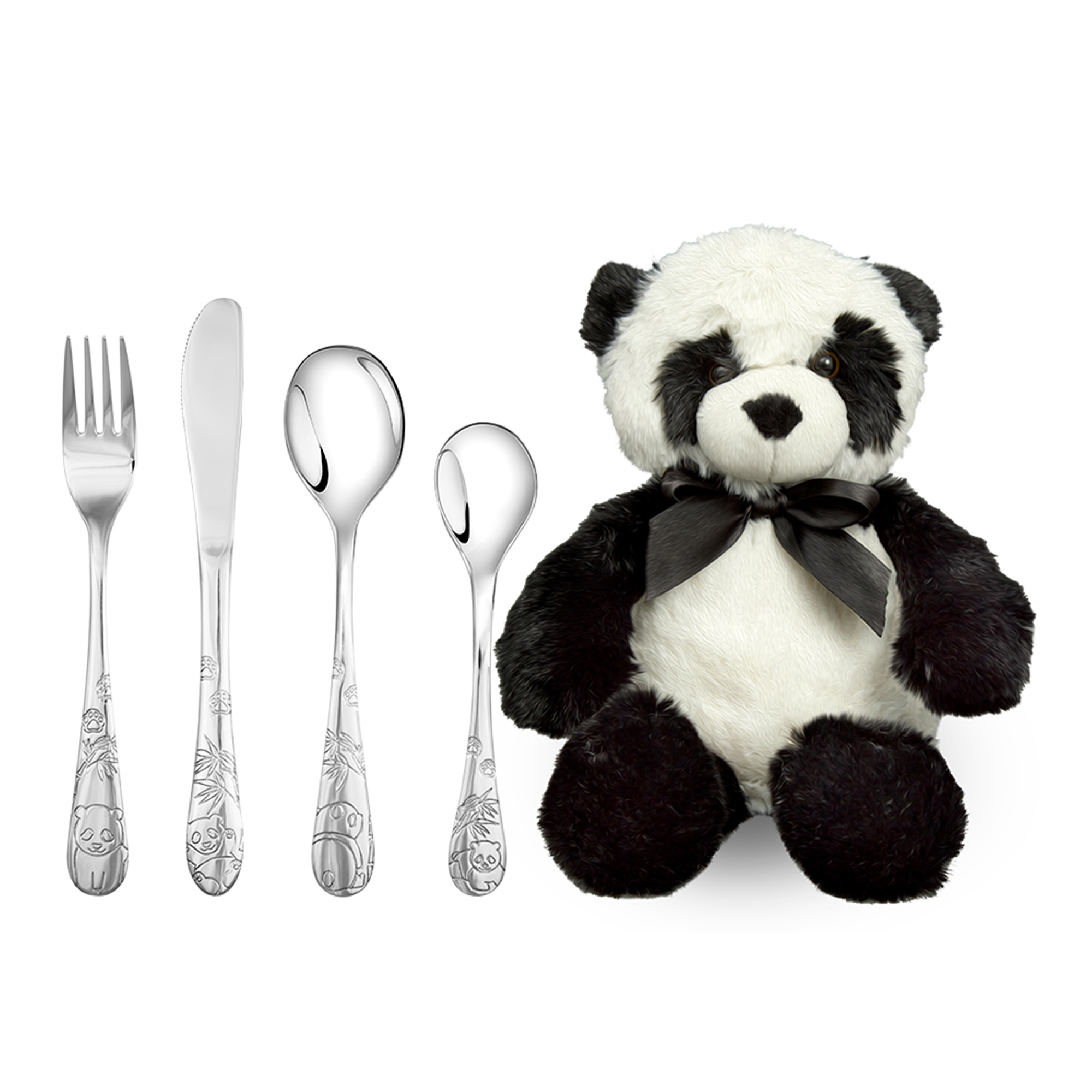 Virkelig kært børnebestik med pandaer udført i rustfrit stål. Sættet indeholder kniv, gaffel, spiseske og teske. Til det fine bestik medfølger der en krammevenlig pandabamse med slø