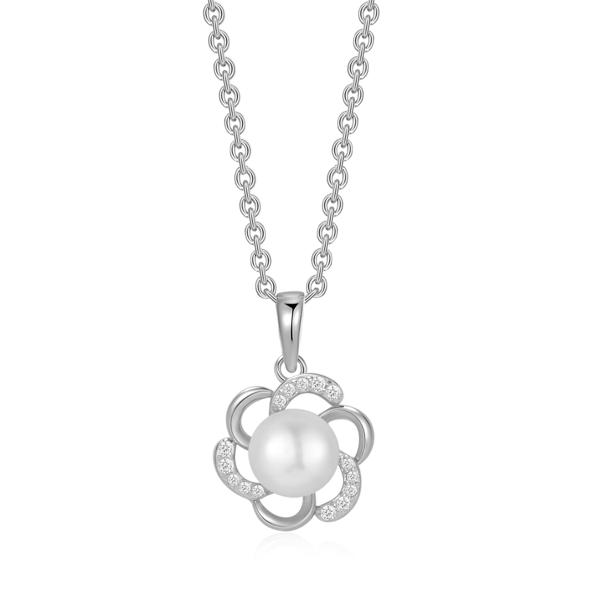 Sølv halskæde rhodineret blomst med syntetiske cubic zirconia og ferskvandsperle.
