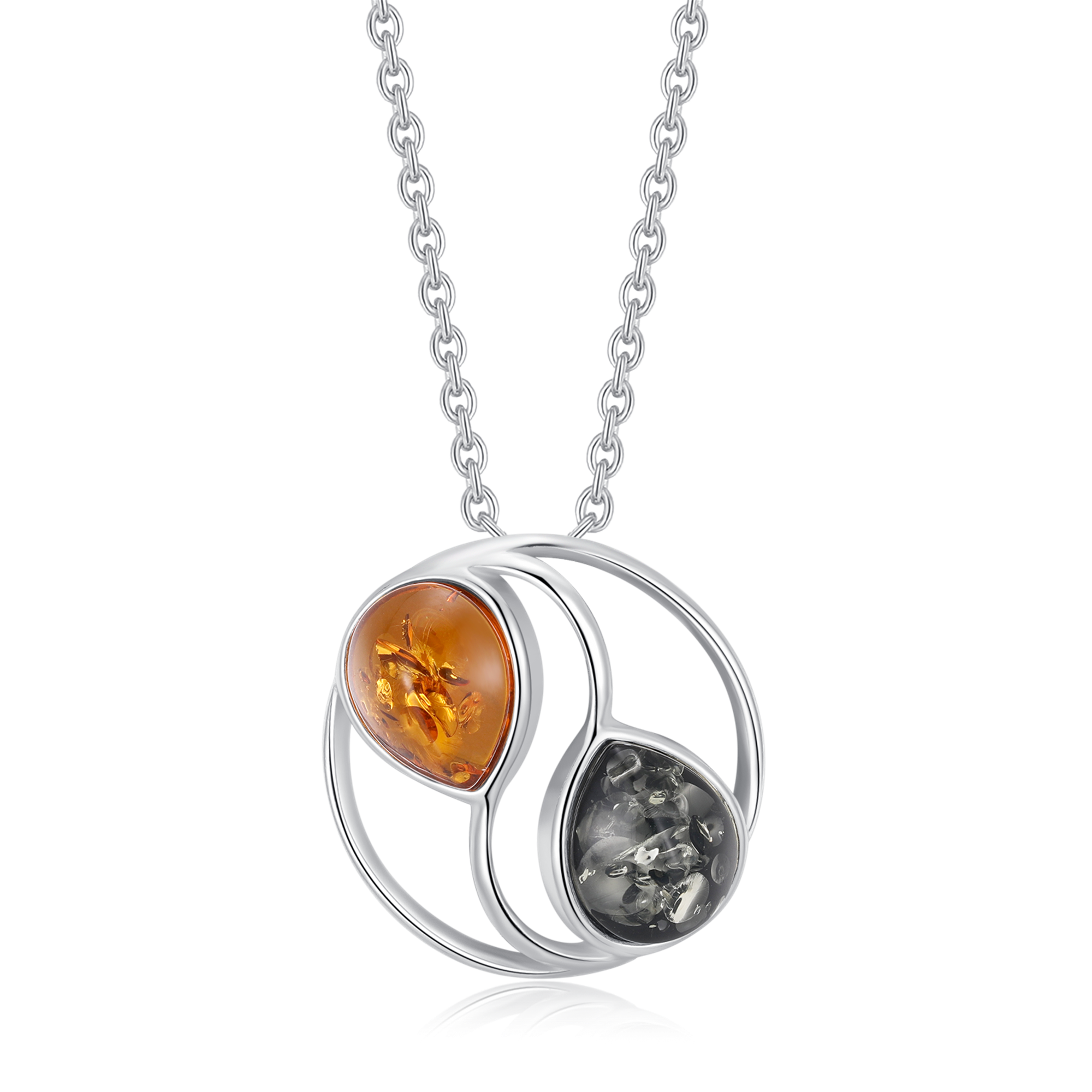 Sølv halskæde rhodineret cirkel med 2 forskellige rav- sort agat og rav.