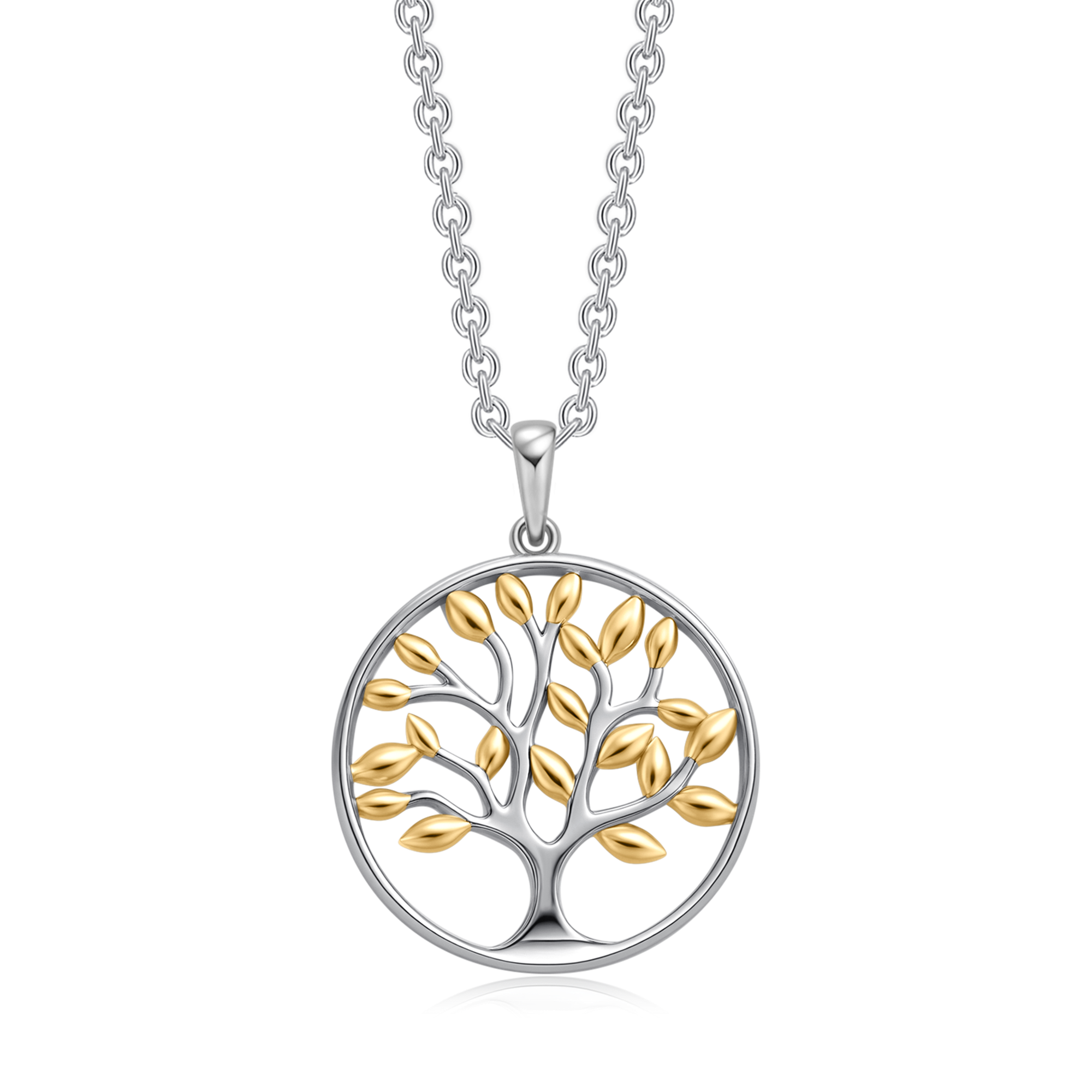 Sølv halskæde cirkel med livets træ og bladene er forgyldte. "Tree of life"