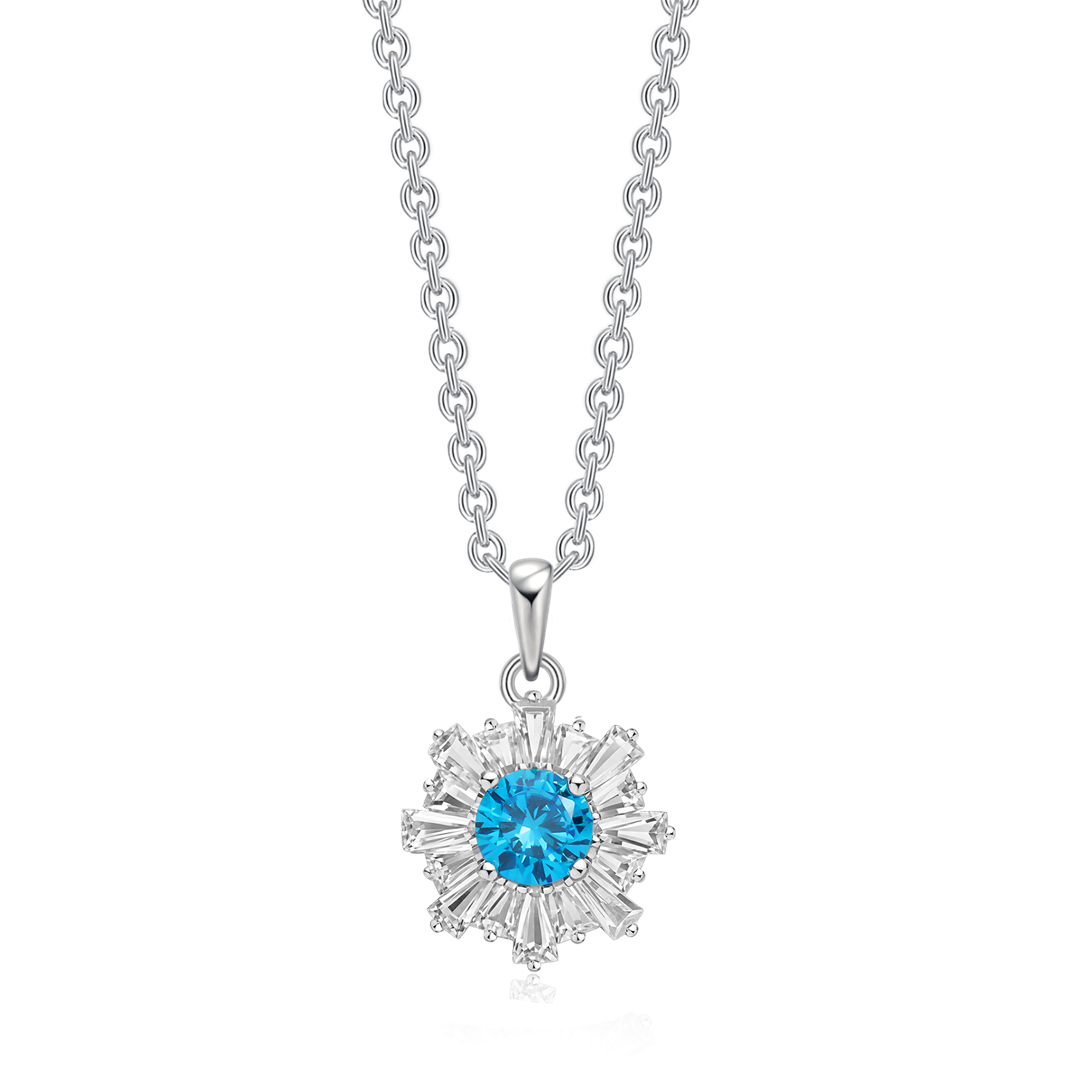 Sølv halskæde rhodineret blomst med syntetiske cubic zirconia rundt om og blå topas i midten.