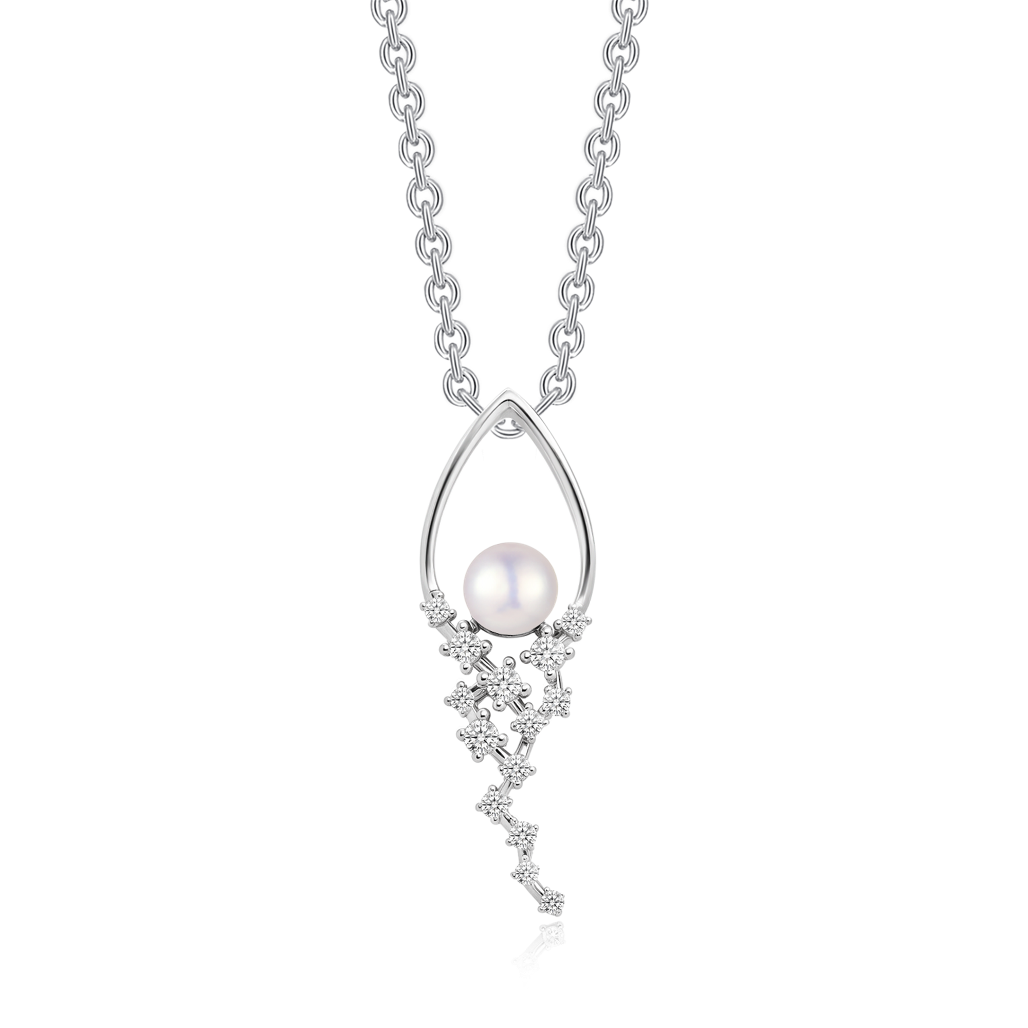 Sølv halskæde rhodineret oval med dråber og syntetiske cubic zirconia og ferskvandsperle i midten.