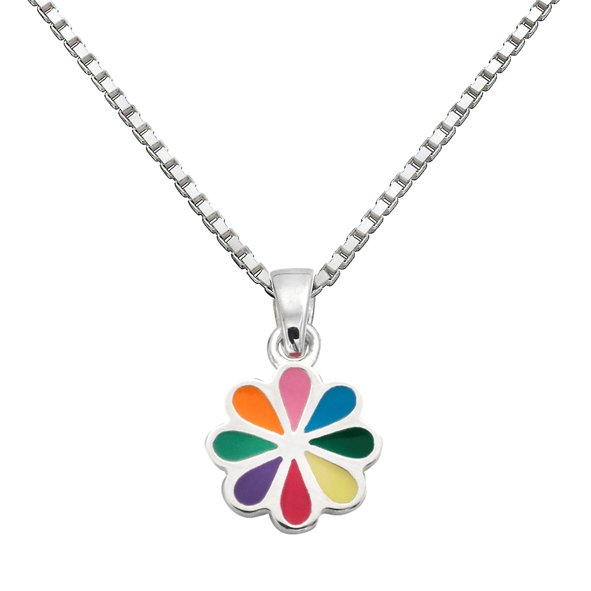 Sølv halskæde blomst med multifarvet blyfri emalje.