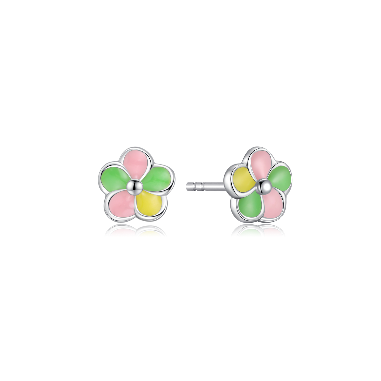 Sølv ørestikker rhodineret blomst i grøn, lyserød og gul blyfri emalje.