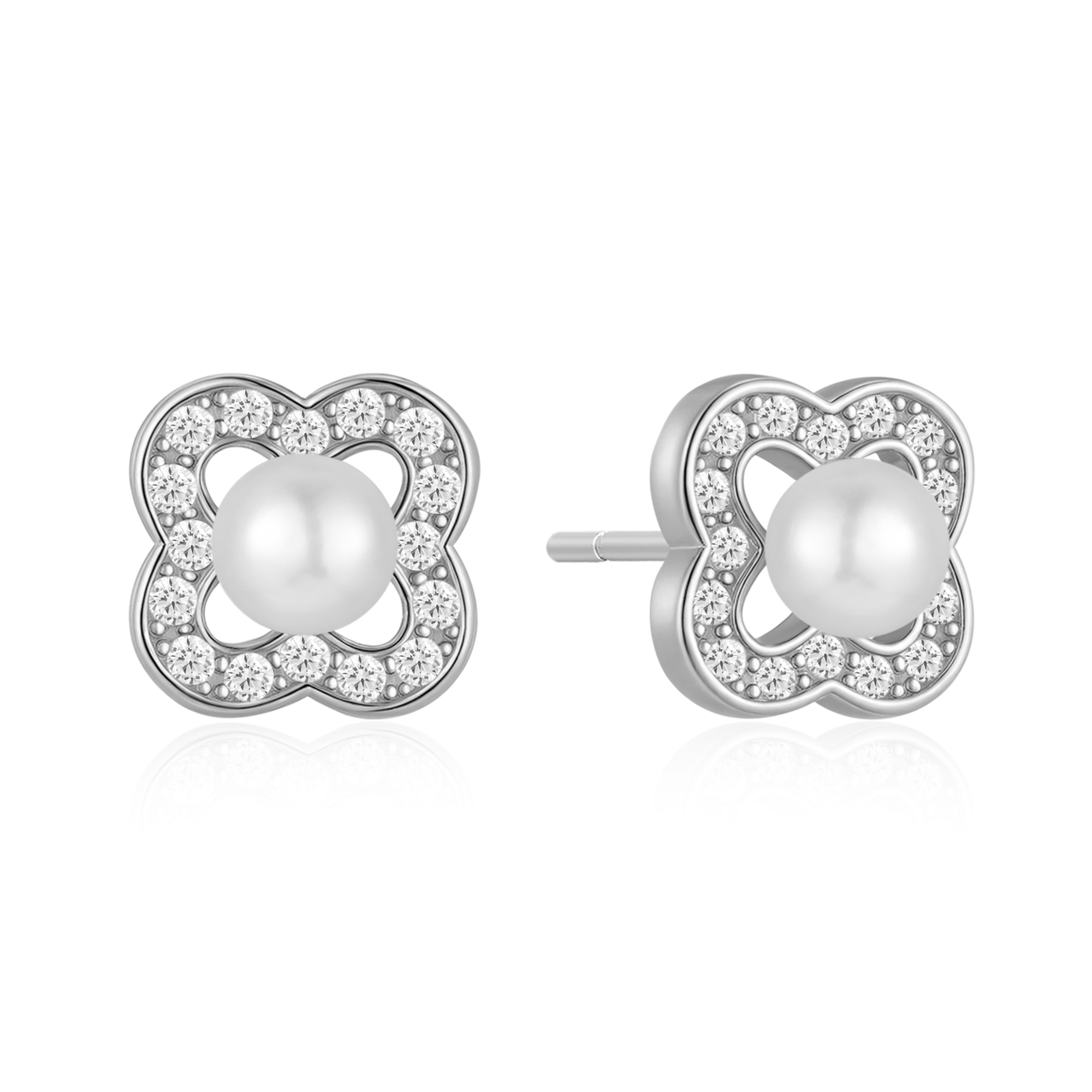 Sølv ørestikker rhodineret blomst med syntetiske cubic zirconia og ferskvandsperle.