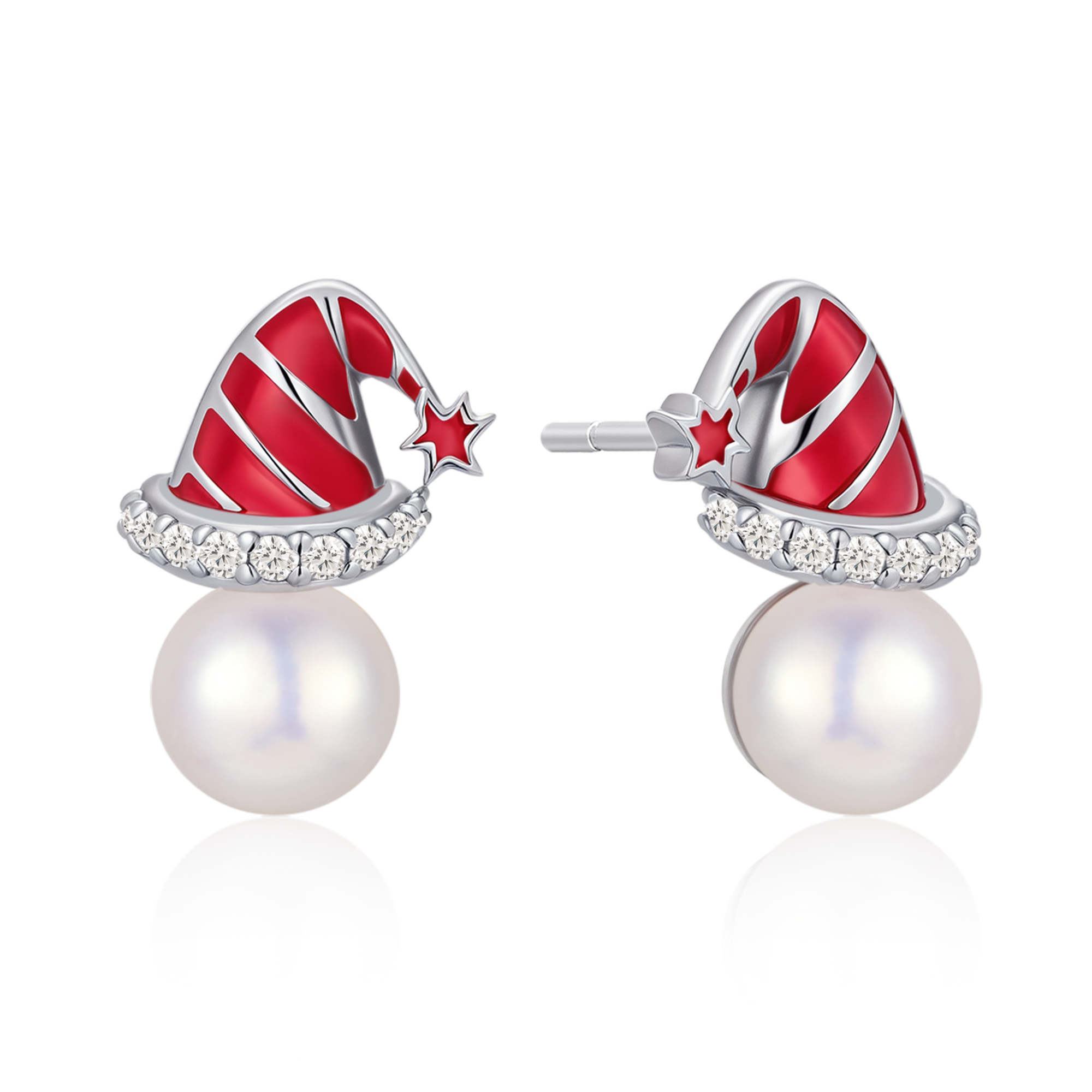 Sølv ørestikker rhodineret rød blyfri emalje julehue med ferskvandsperle og syntetiske cubic zirconia.