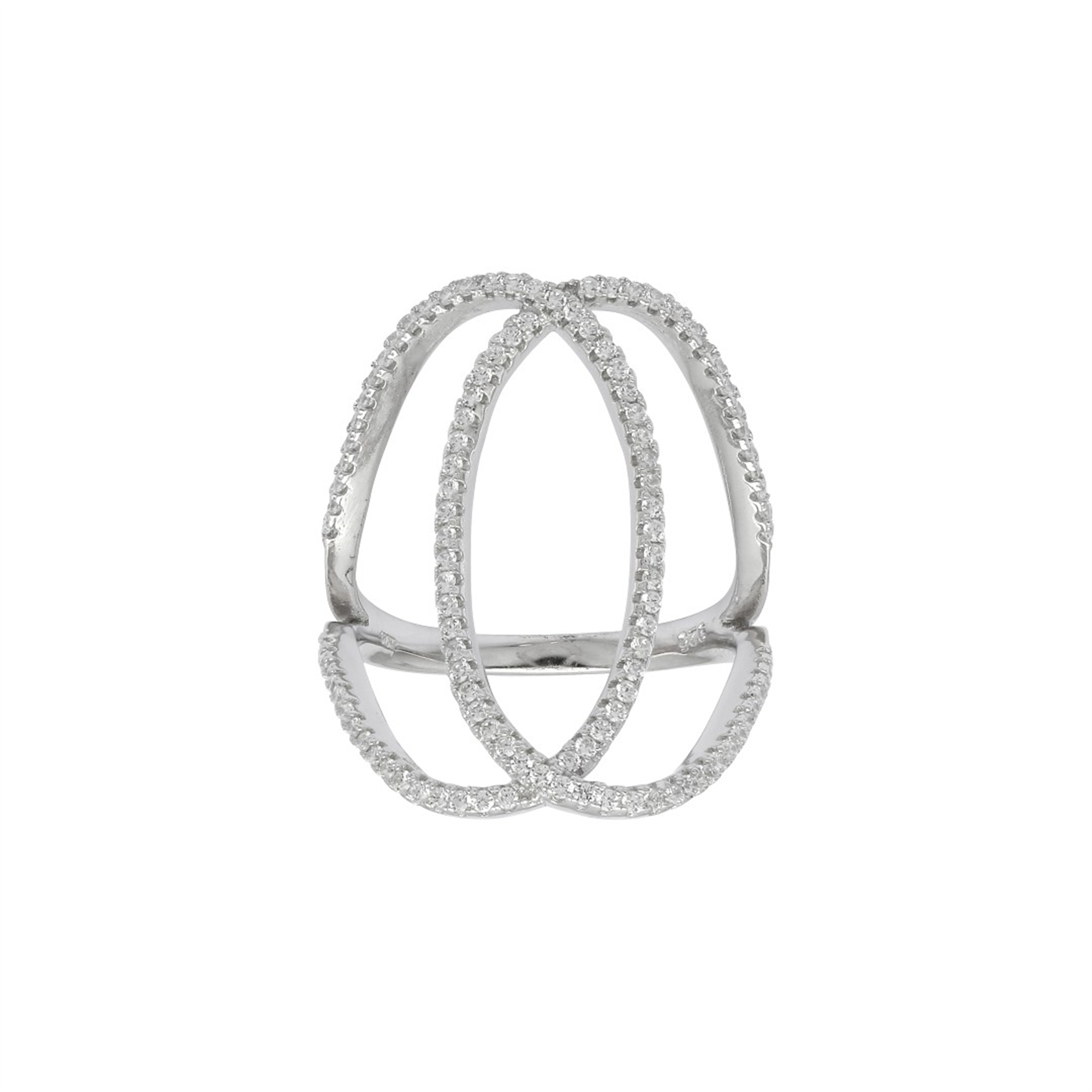 Fascinerende og elegant ring, fra vores Alaine serie, til den stilbevidste kvinde! Denne rhodineret sølvring har et smukt symmetrisk design udgjort af to ovale former, der overlapper. Ringen er besat med funklende zirkonia sten, som giver smykket et fe