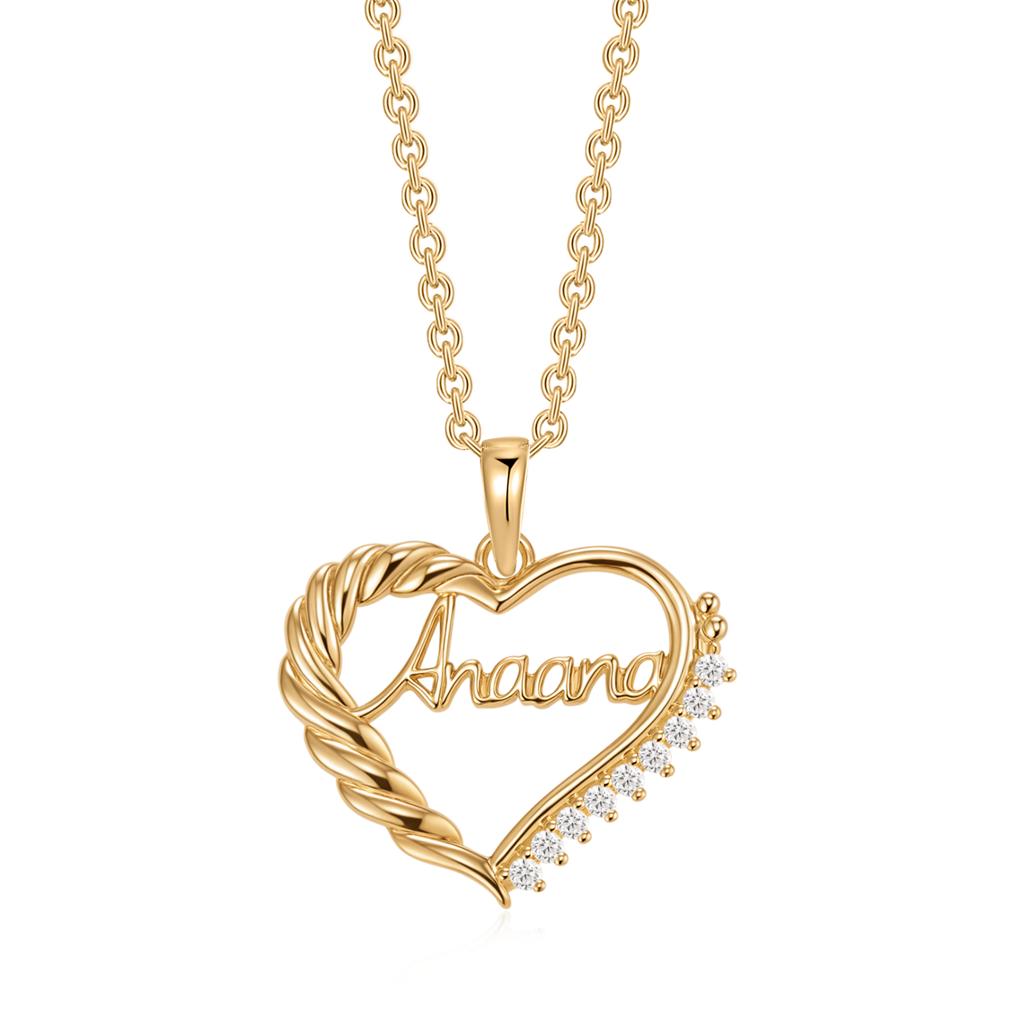 Sølvforgyldt halskæde hjerte med tekst Anaana og syntetiske cubic zirconia i den højre side af kant.