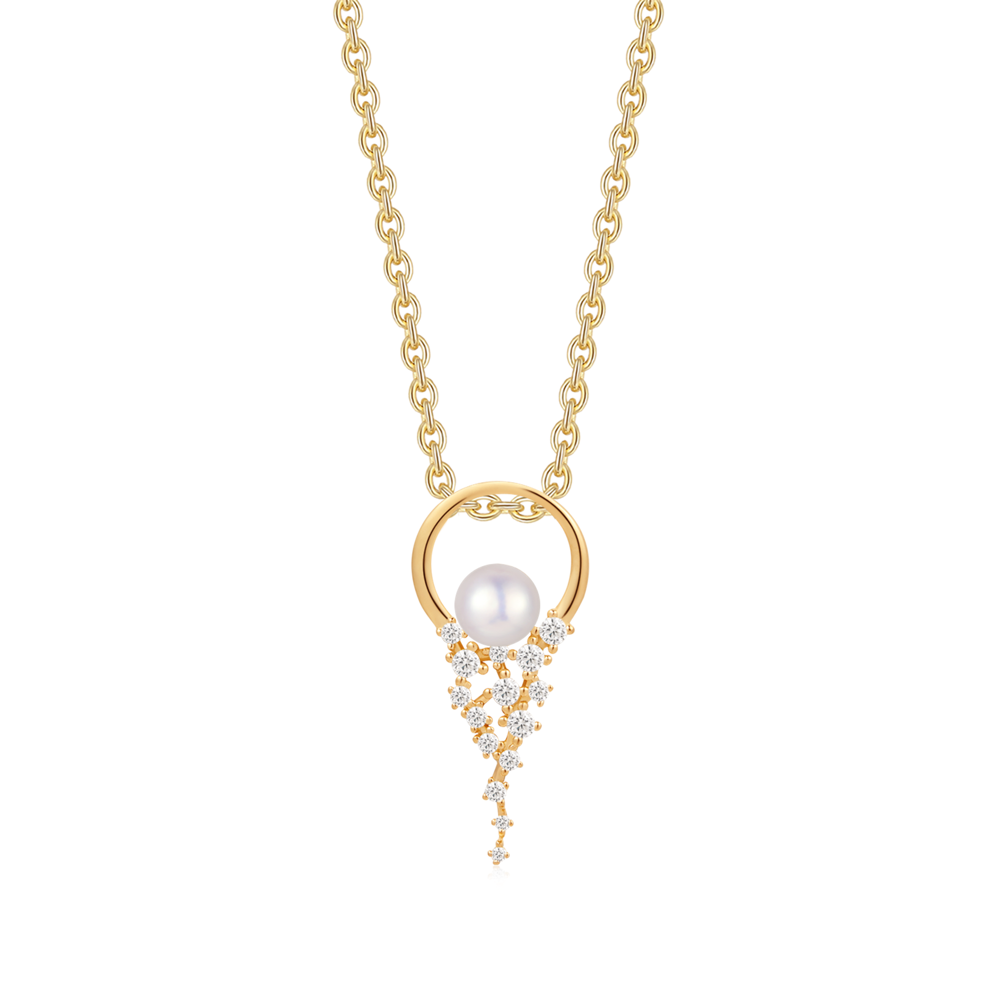 Sølvforgyldt halskæde cirkel og dråber med syntetiske cubic zirconia og ferskvandsperle i midten.