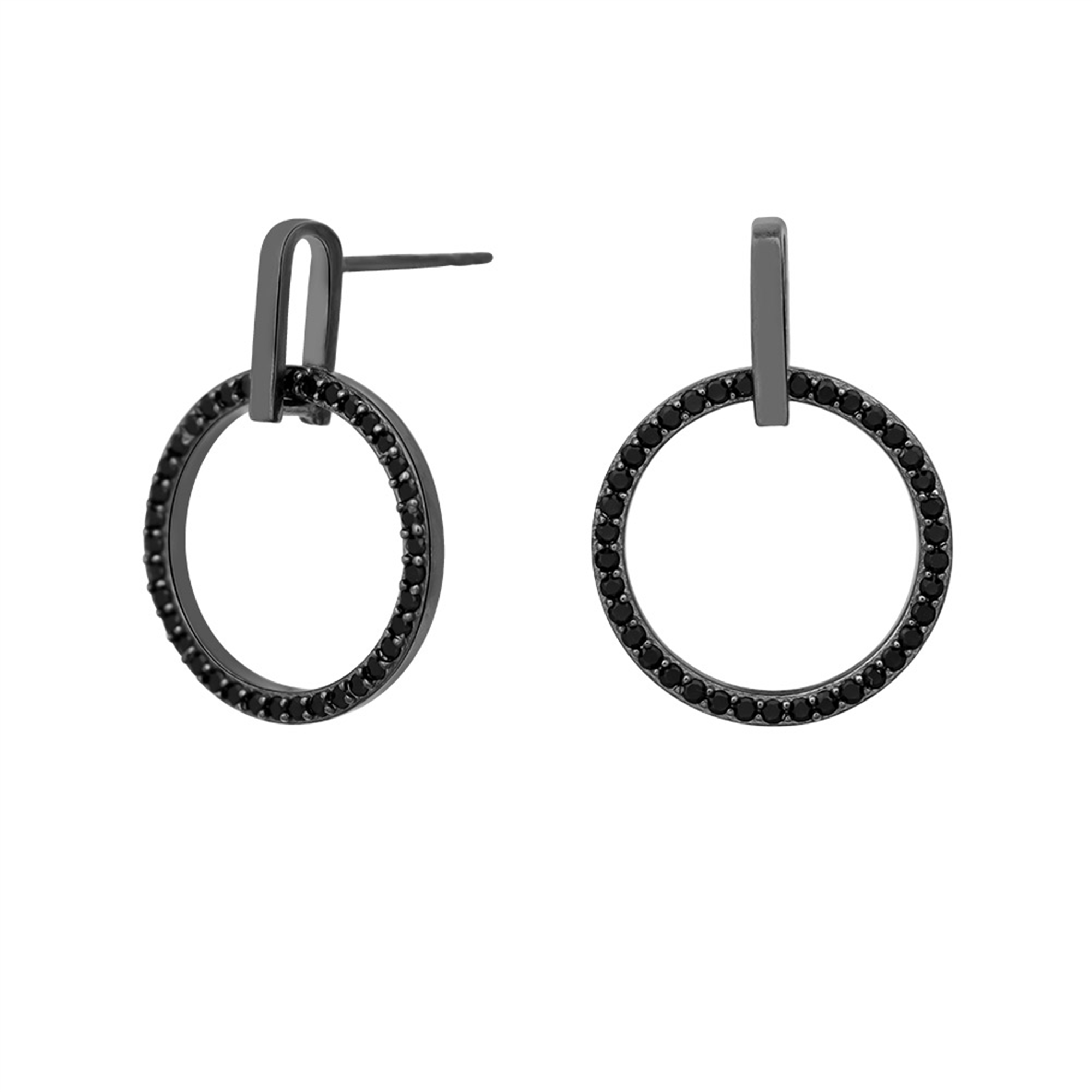 Elegante og glimtende ørehængere. De smukke ørehængere i sort rhodineret sølv fra vores AnnaNor serie vækker opsigt og beundring. Den kubisk zirkonia besatte cirkel hænger bevægeligt i leddet, hvilket givet smykket bevægelse og liv, der rigtigt lade
