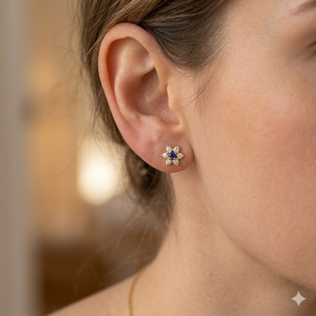8 karat øredobber med blå safir i midten og 6 hvite zirkoner i grenene,