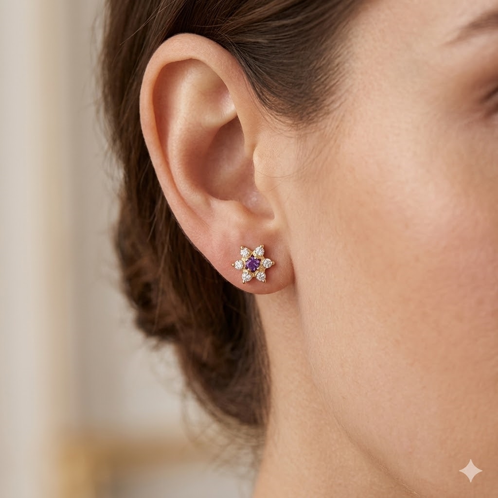 8 karat øredobber med lilla ametyst i midten og 6 hvite zirkoner i grenene,