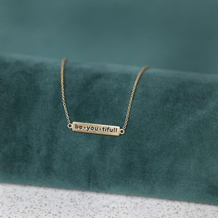 Story av Kranz & Ziegler anheng i forgylt sølv med teksten "Be you tifull" og 45 cm kjede